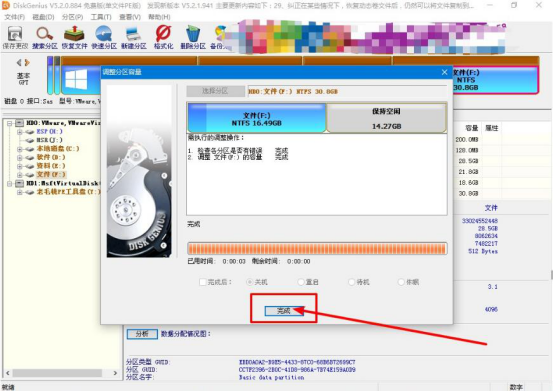 7.回到老毛桃winpe调成分区容量窗口,可以看到拆分硬盘分区的进度,当拆分完成了,我们就点击“完成”按钮。