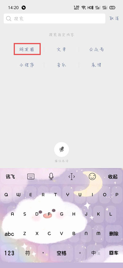 3、接着输入框的左侧会显示朋友圈图标,输入需要查找的内容关键词;