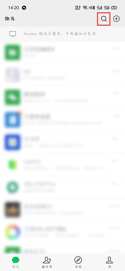 1、打开手机中的微信,在首页消息页面点击右上角的【搜索】按钮;