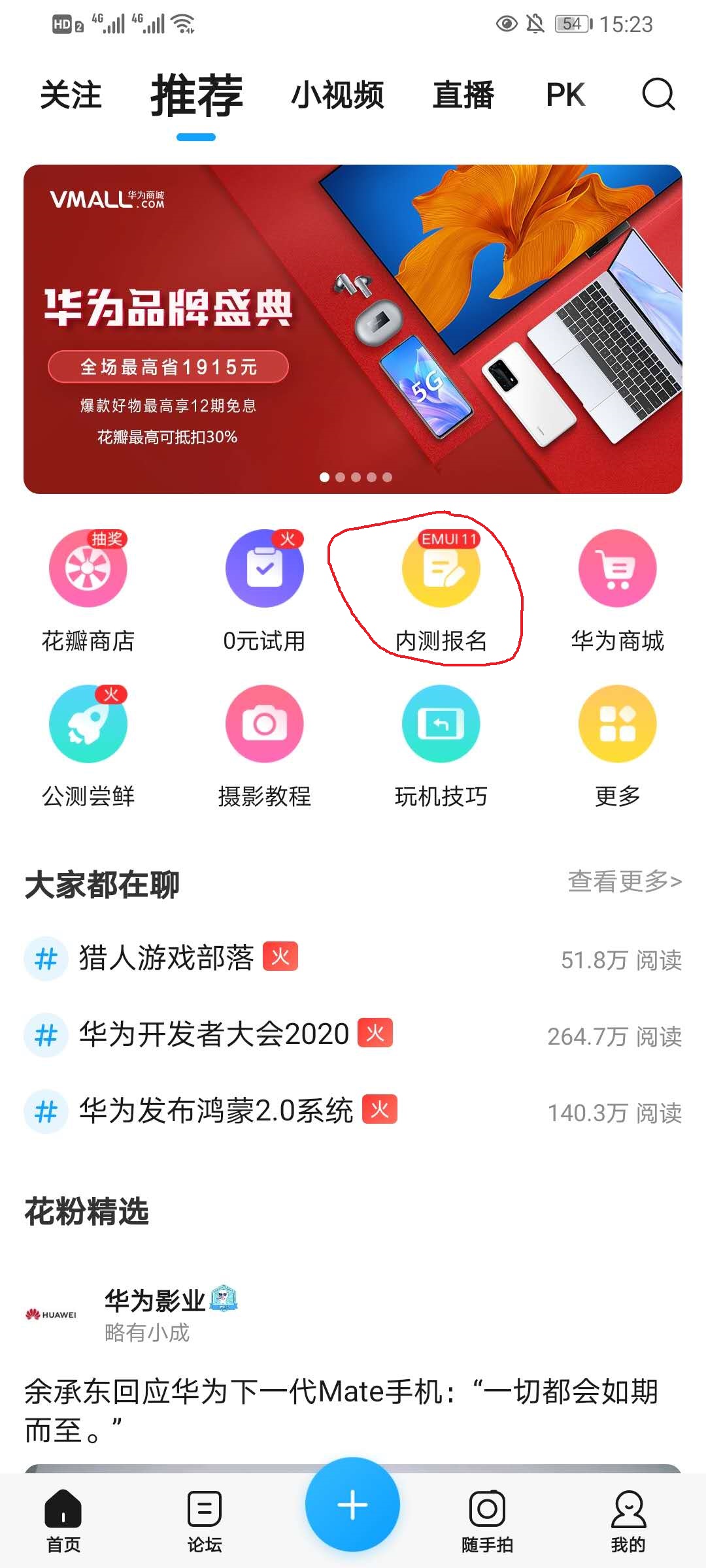 1、华为手机用户需要打开手机中的花粉俱乐部,进入花粉俱乐部APP,点击上方的内测申请。
