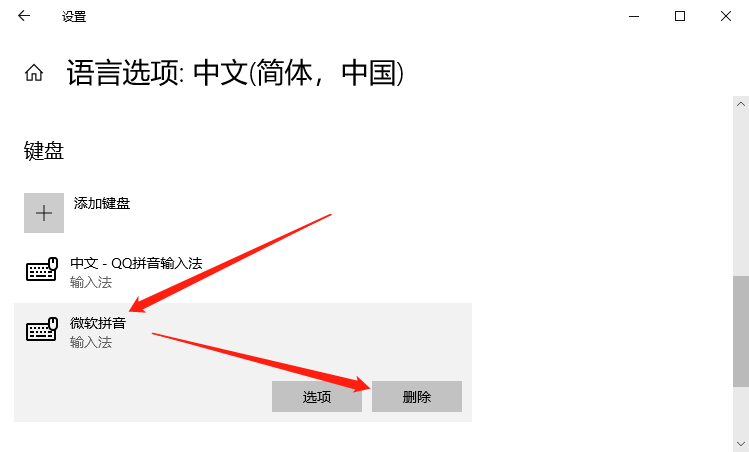 3、然后下滑,找到“键盘”,点击【微软拼音】,选择【删除】一项;
