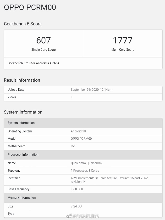 骁龙765G单核跑分为607,多核跑分为1777。