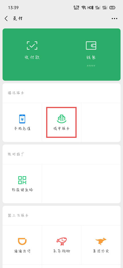 2、接着在支付页面选择【城市服务】一项;