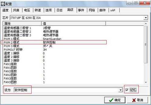 2、弹出配置窗口,选择【温度】标签页,然后选中【PWM 2模式】,下方的“设为”的选项框内点击右侧倒三角图标,在下拉列表中选择【软件控制】,并勾选右侧【记忆】。