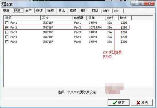 6、再次点击【配置】,在弹出的配置窗口选择【风扇】标签页,勾选【FAN2】,点击【确定】。