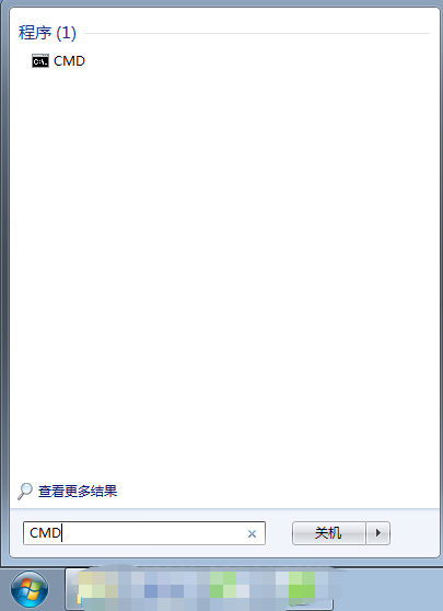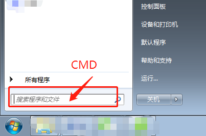 2、点击桌面左下角【开始】,在搜索程序和文件的文本框输入CMD,然后回车。