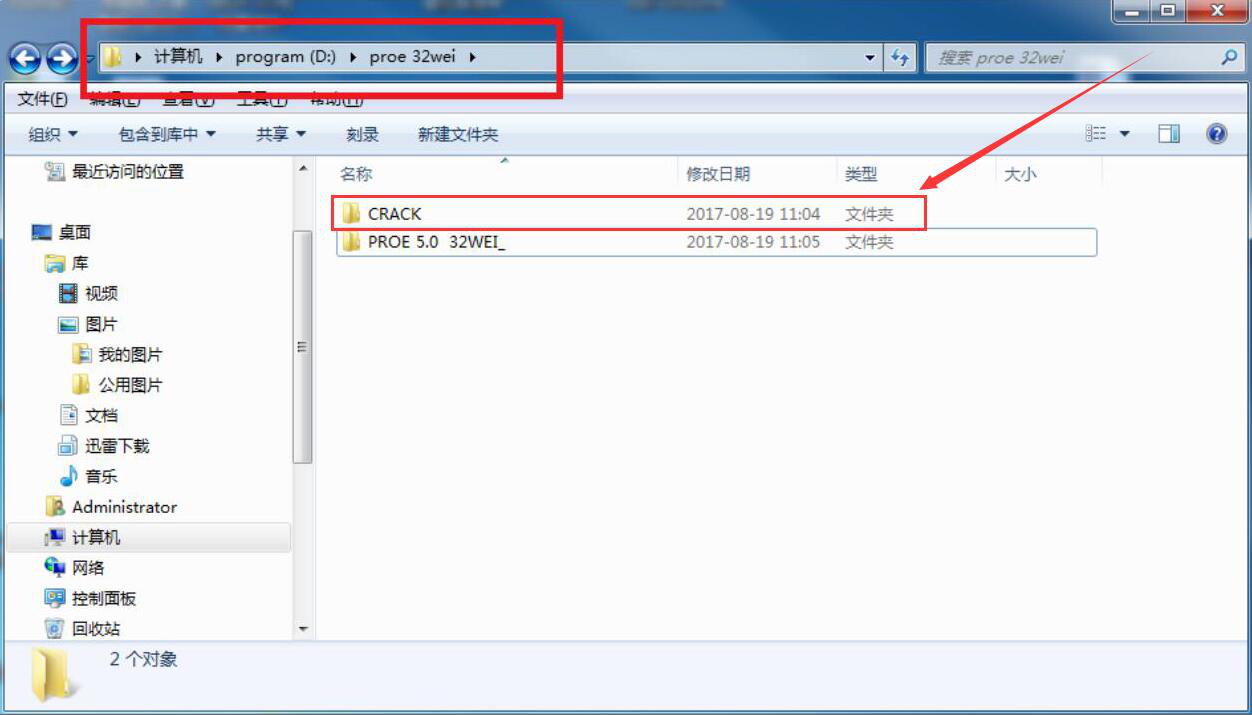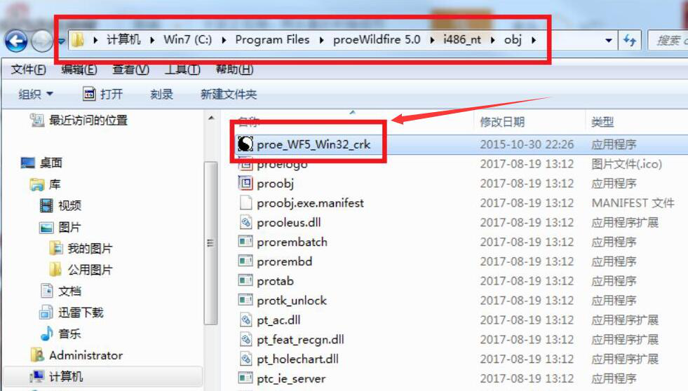 13、proe5.0的主程序安装完成,接下来我们开始安装它的补丁程序。回到crack文件夹,将“proe_WF5_Win32_crk”应用程序复制到obj路径下再双击运行。
