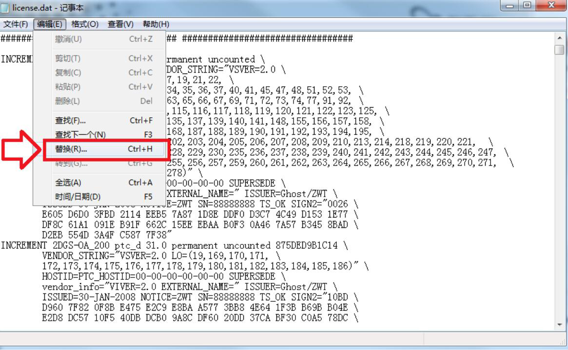 3、再用记事本的方式来打开该文件夹中的“license.dat”文档。点击“编辑”菜单中的“替换”。