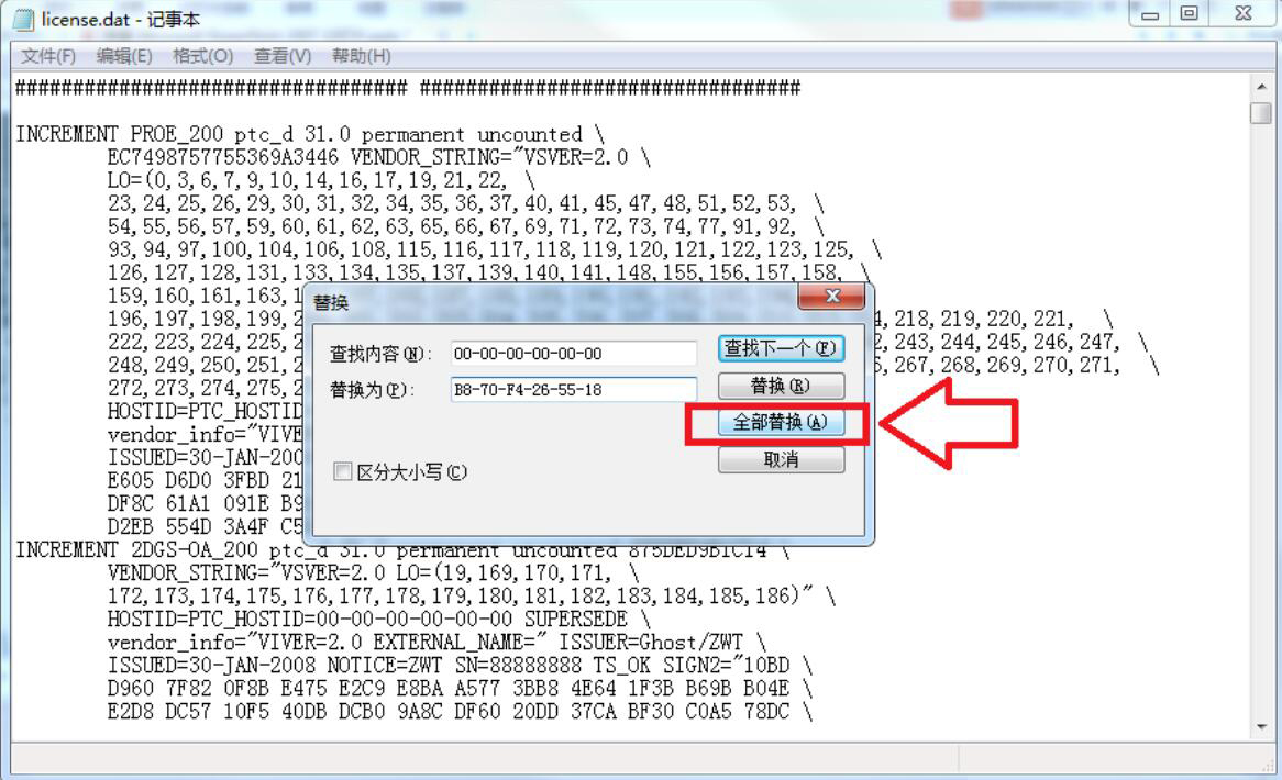 4、在弹出的替换窗口中,查找内容中输入“00-00-00-00-00-00”,而替换为则输入主机的ID,再点击“全部替换”按钮。