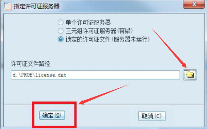 9、在弹出的“指定许可证服务器”窗口中,点选“锁定的许可证文件”,并点击文件夹按钮将刚才我们做好的许可证文件选中,点击“确定”按钮。