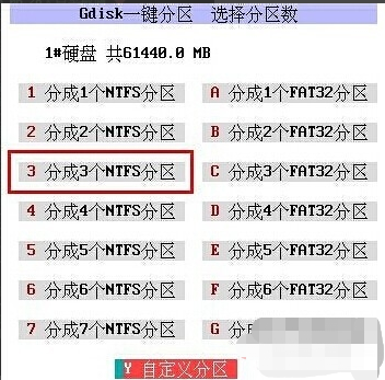 7、弹出分区数选择窗口,这里会显示本机电脑的硬盘大小,用户可以根据硬盘大小和自身需要选择分区数目,当然也可以点击【自定义分区】自行设置分区性质和数目,如果是新手的话不推荐。