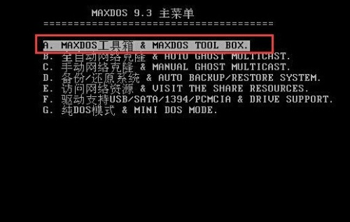 3、进入到DOS界面,在MaxDos主菜单下,选中【MAXDOS工具箱&MAXDOS TOOL BOX】,之后点击ENTER键。