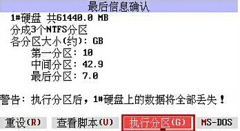 9、以上都设置完之后就进入到最关键的一步—执行。在弹出的最后信息确认窗口中,选中【执行分区】之后点击ENTER键,MaxDos工具箱就开始按照用户设置对硬盘进行分区操作。