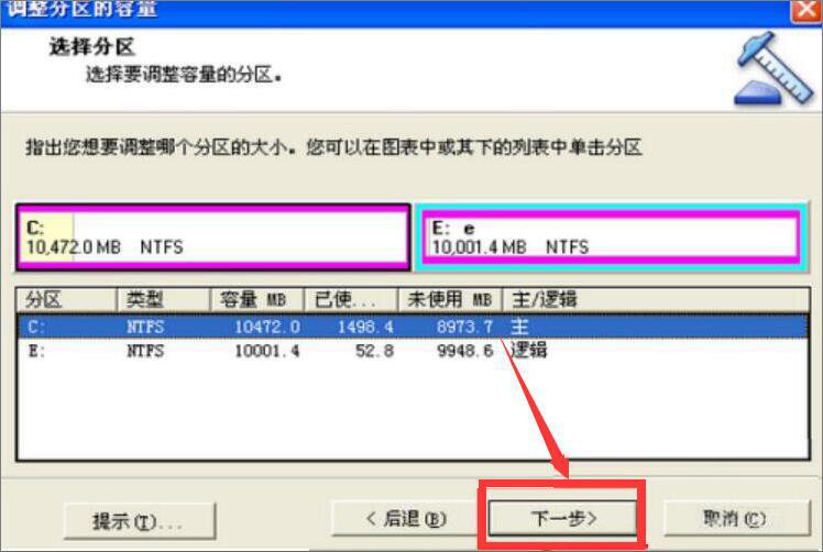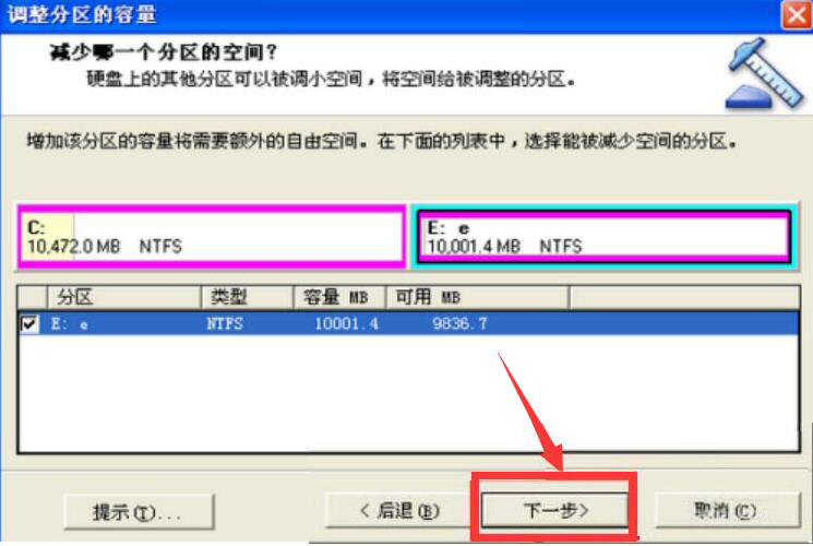 5、C盘要增加的空间设置好了,我们还要选择其他空间多的磁盘,将它的多余空间调整到C盘,比如说我们将E盘的多余空间调整给C盘,就点击E盘,再点击“下一步”按钮。