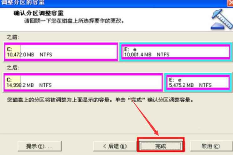 6、此时,我们便可以看到pqmagic给C盘增加的空间,它会自动罗列出调整之前和调整之后的空间值,确认无误,点击“完成”按钮。