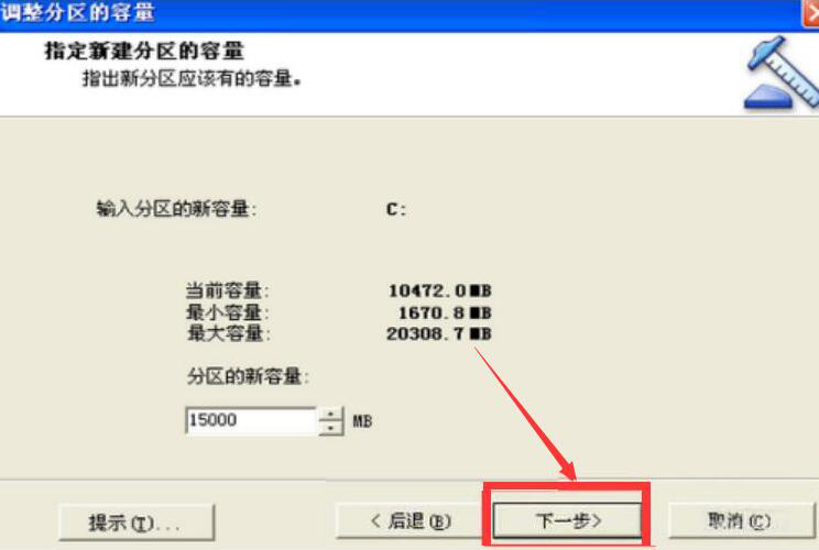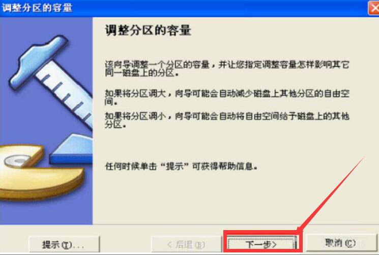 2、弹出调整分区的容量窗口,我们直接点击“下一步”按钮。