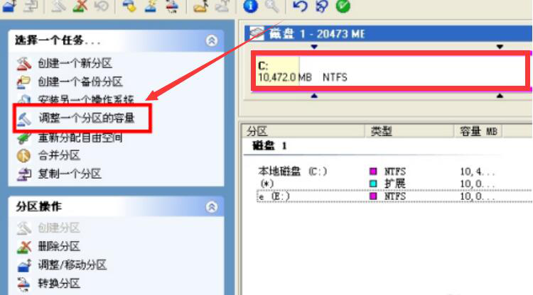 1、首先,打开分区魔术师pqmagic,在该软件的左侧点击“调整一个分区的容量”。