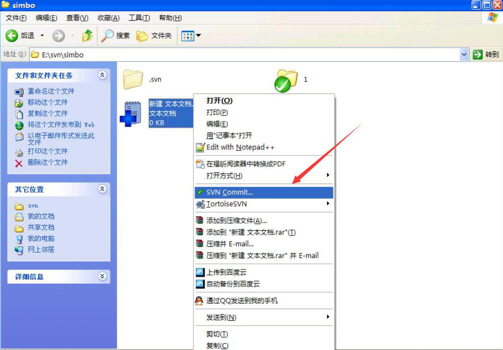 6、此刻,我们可以看到刚才被打了问号的文件变成了加号,这说明Tortoisesvn已经将该文件收录。我们右键单击该文件,并在右键菜单中点击“SVN Commit”。