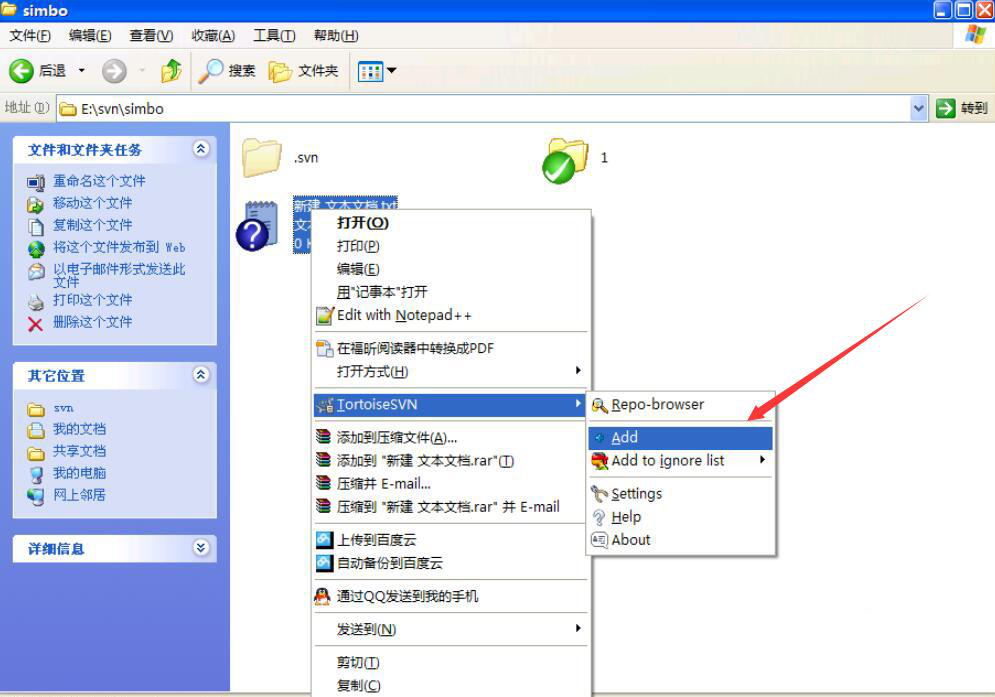 5、接下来,我们在该文件夹中新建一个要Tortoisesvn上传的文件,可以看到它被打上了一个问号。我们右键单击它,并依次点击“TortoiseSVN”、“Add”。