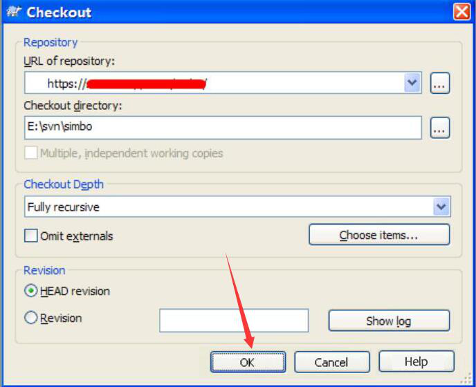2、此时,Tortoisesvn会弹出“Checkout”窗口,在窗口中输入远程Tortoisesvn库中的URL地址,并点击“OK”按钮。