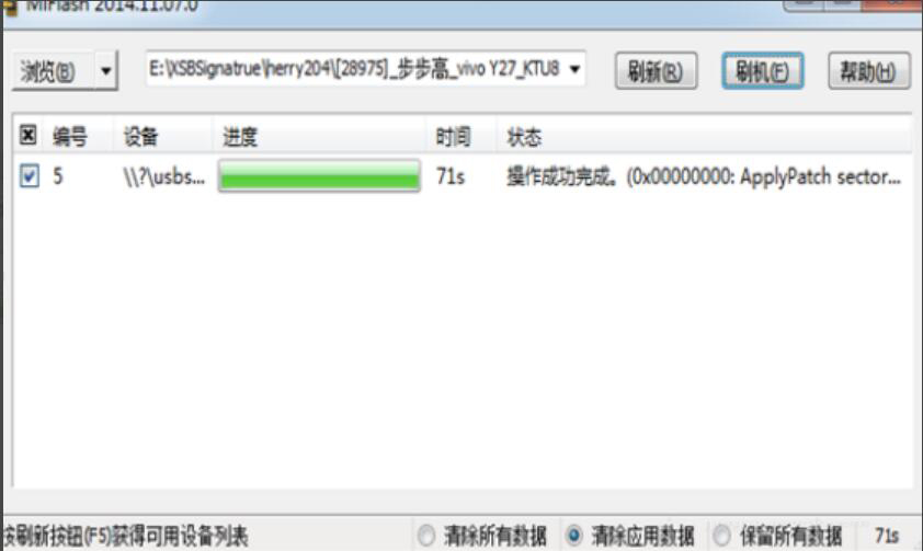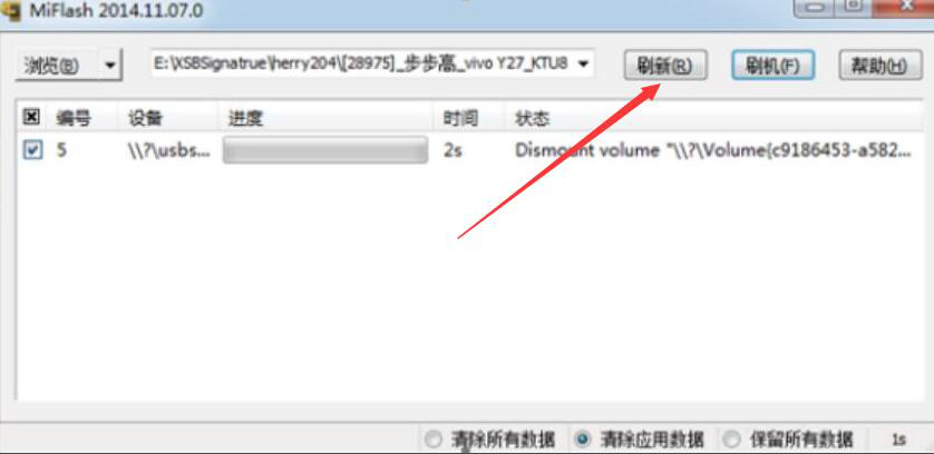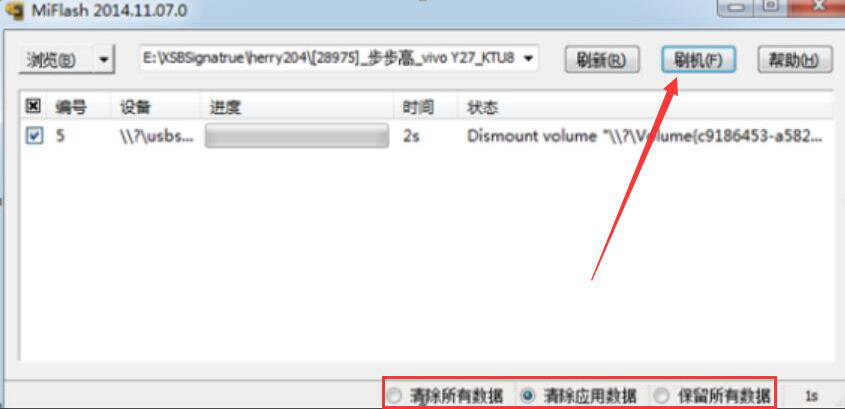 5、在用MiFlash刷机前,我们还可以根据自己的需要对手机原来的数据选择是否清除或保留,再点击“刷机”按钮,MiFlash便开始执行刷机命令。
