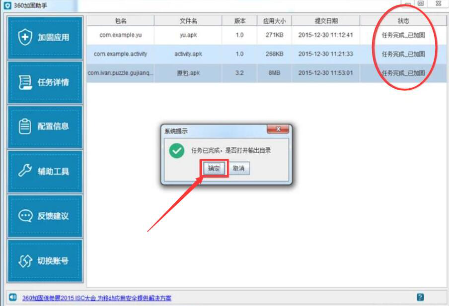 4、当安装包加固完成后,我们可以在状态栏中看到“任务完成_已加固”,并且在它弹出的系统提示窗口中,点击“确定”按钮,即可打开加固后的安装包输出目录。
