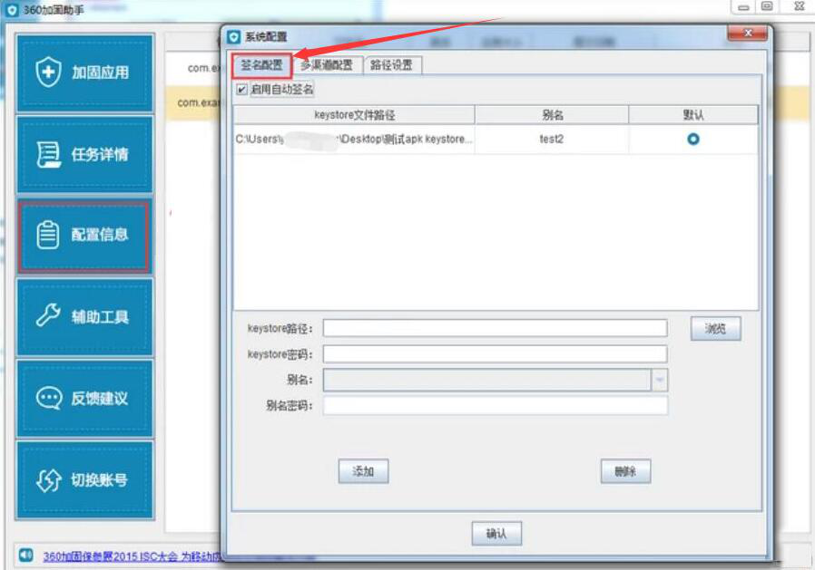 5、接下来,我们还可以为刚才加固的安装包添加签名。点击360加固助手左侧功能栏中的“配置信息”,便会弹出系统配置窗口,在此窗口中,点击切换至“签名配置”选项卡。