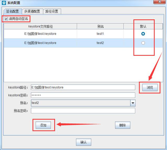 6、最后,勾选“启用自动签名”,点击“浏览”按钮,选择“*.Keystore”文件,输入Keystore密码和别名,并点击“添加”按钮和“确认”按钮,安装包自动签名成功。