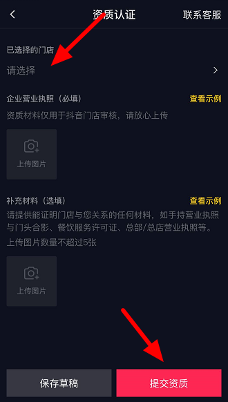 进入资质认证服务窗口,选择门店,上传企业营业执照、补充材料图片,点击【提交资质】,等待官方审核即可。