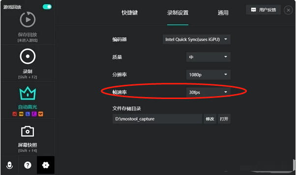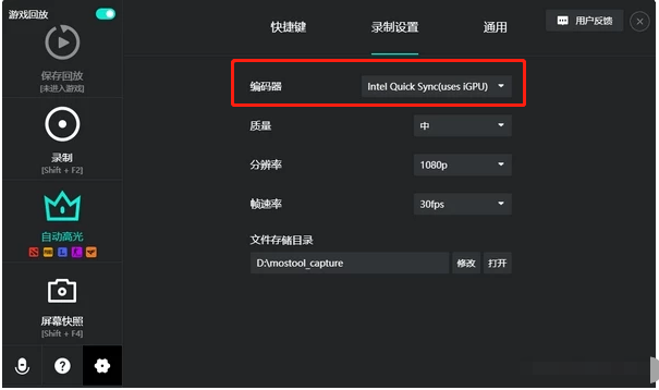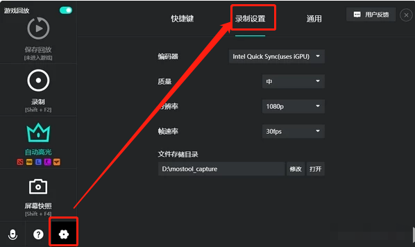 1、打开AQ录制软件,点击左下方小齿轮图标(即设置),然后选择【录制设置】标签页,这里有编码器(显卡相关)、质量(画面)、分辨率、帧速率等选项。