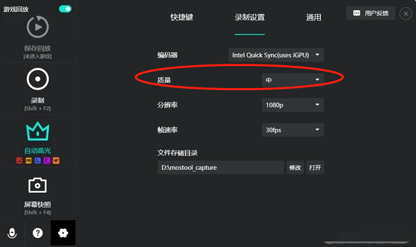 3、第二个是质量。点击质量右侧对应的倒三角图标,降低录制视频的画面质量级别,最好设置为中,如果卡顿非常严重的话,可以尝试设置为低,不过这样录制出来视频看起来比较费劲,慎选!