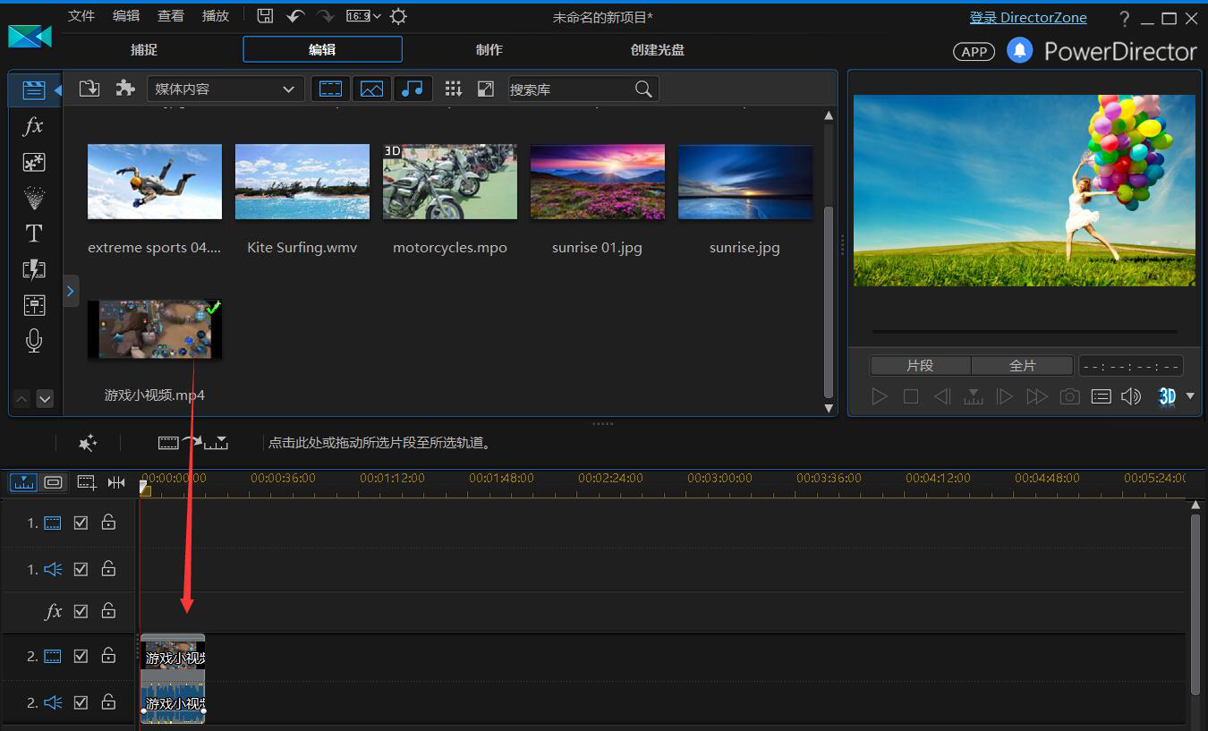 3、然后在威力导演的界面中点击选中该视频素材,并将它拖放至时间线上的第2个图层,如下图。