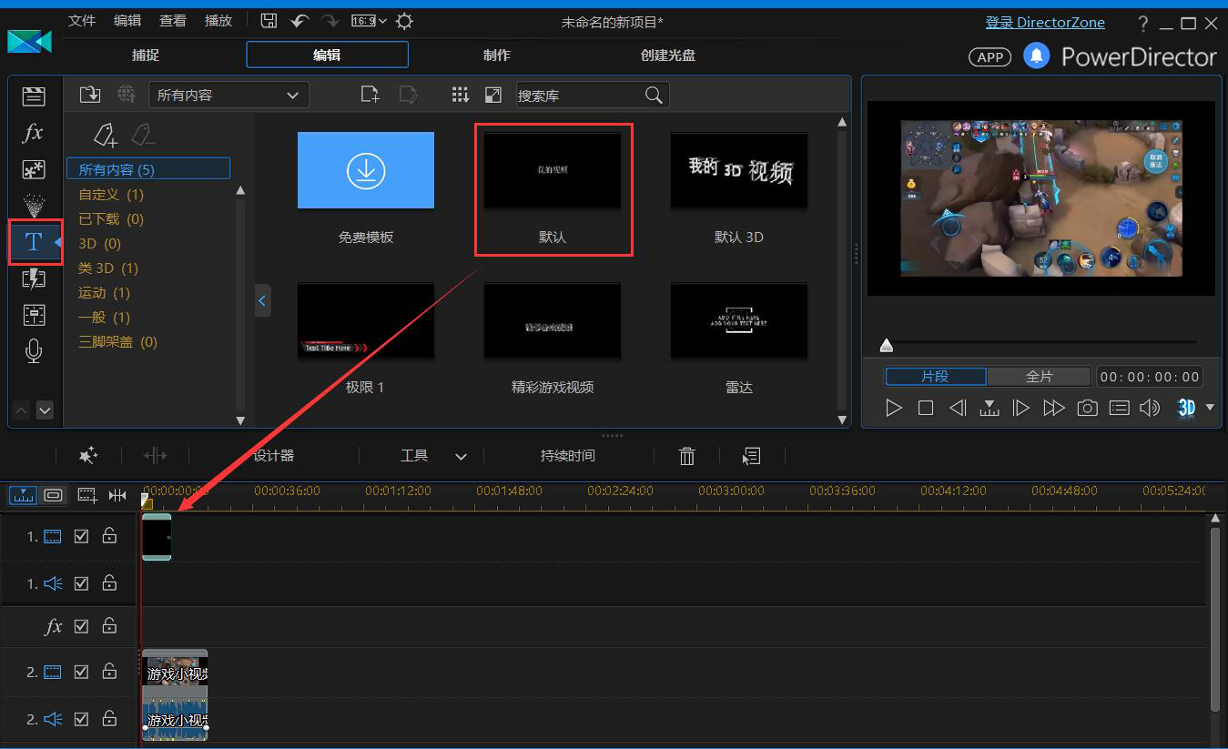 4、接下来,我们点击威力导演功能栏中的“标题室”工具,并在众多标题样式中选择自己喜欢的字幕模板,将它拖放至时间线上的第1个图层,如下图。