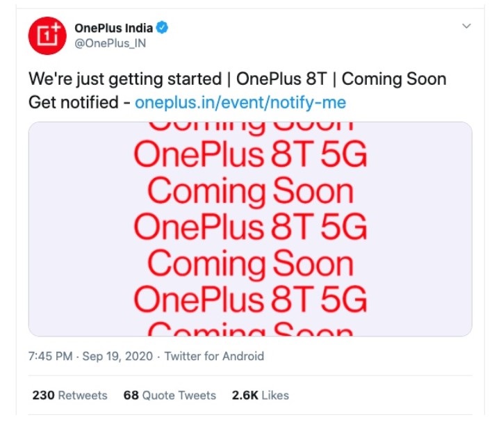 一加已经确认,将很快推出下一款旗舰——OnePlus 8T 5G。该公司在其社交媒体 Twitter 和 Instagram 上透露了这款手机的名称,并宣布它 “即将到来”,这款手机此前被传将于 10 月 14 日推出。