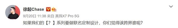 9月20日,realme副总裁、全球营销总裁徐起在微博发起了一项提问,“如果我们的[?]系列要做联名定制设计,你们觉得该跨界谁呢? ”该问题一出,其实受到了不少网友的反馈,比如有人回答“只要是潮牌就行”,也有人回答“必须得跟动漫联名,找一些大lP动漫”,该条更是获得了徐起的回复,似乎向我们透露了一些消息。