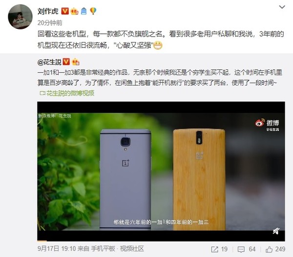 近日,有网友在微博上发布了一加1和一加3两款手机的体验视频,称它们“非常经典”。该微博在不久后被一加手机创始人刘作虎转发。