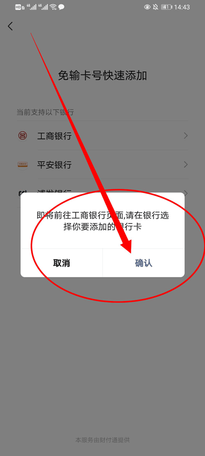 2、在“免输卡号快速添加”界面选择想要绑定的银行卡,点击进入(下面小编以工商银行为例)。