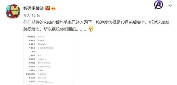 据知名数码博主@数码闲聊站 爆料的信息,Redmi品牌智能手表的上市日期大概是10月份前后,这款产品的主打卖点是长时间使用,且续航非常出色。另外,该博主还暗示这款手表运行的是小米自家的手表系统。