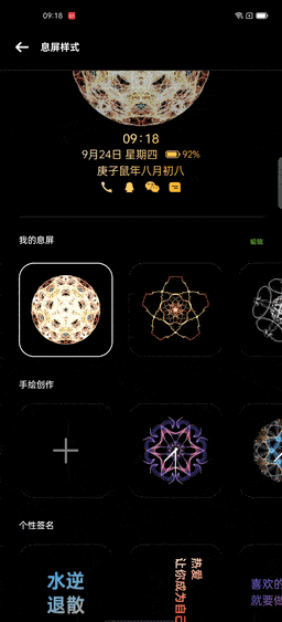 灭屏显示上也考虑到了你的需求推出无线息屏功能。在纯黑色的背景上点触移动,就可以生成不同样式的息屏图案。也可设置笔触的花纹、粗细、以及颜色,画到不一样的效果。随手一画就是你的图案。