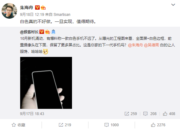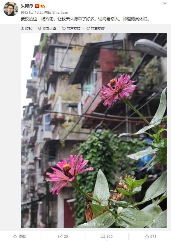 昨天下午,朱海舟在微博发布一张疑似坚果新机的实拍样张,附文:“武汉的这一场冷雨,让秋天来得早了好多。试问卷帘人,却道海棠依旧。 ”微博小尾巴显示为”Smartisan”,引发粉丝纷纷猜测:“这肯定不是pro3拍的”“新机这个拍照效果可以了,能发布了!”。