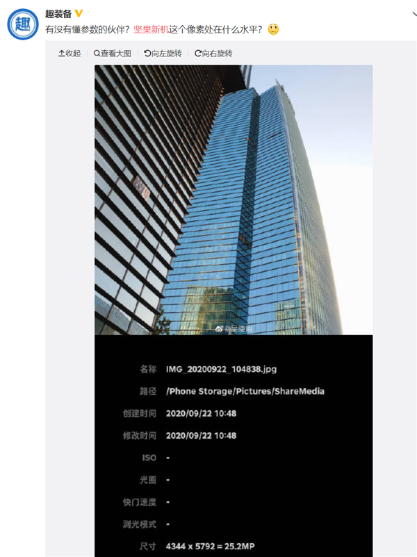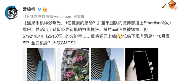 已有网友扒出样片参数信息,虽然exif信息被抹掉,但从5792*4344(2516万)的分辨率来判断,坚果手机相机配置达到旗舰水准,搭载大底CMOS,不出意外也会是1亿像素。