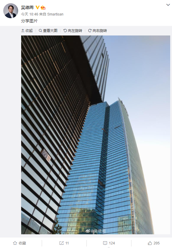 今天上午,吴德周同样在微博晒出一张新机实拍样张,微博小尾巴也是”Smartisan”。由此不难猜测,二人已经提前用上坚果新机了,在微博晒照,显然是在暗示坚果新机的拍照将有重大升级。