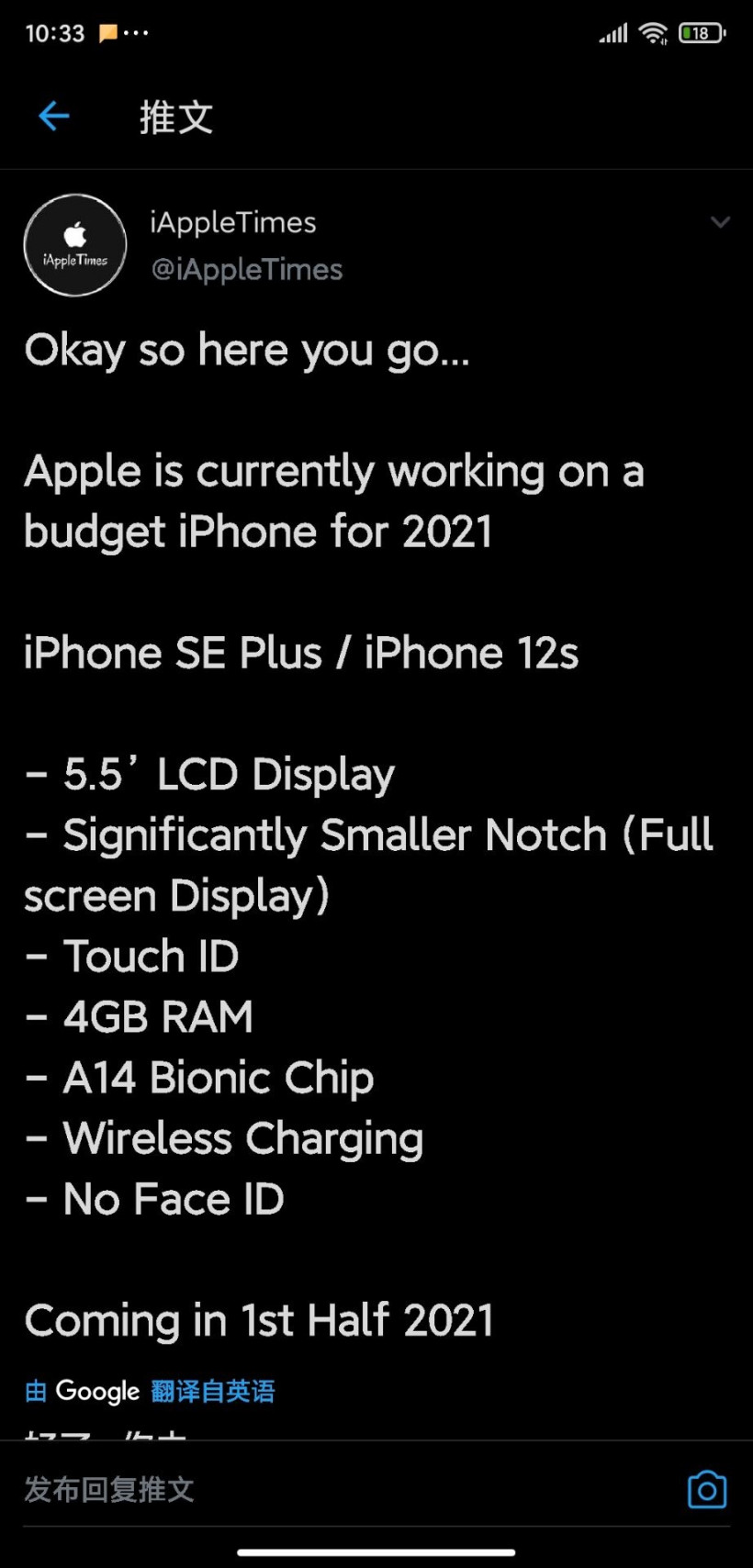 近期也有国外博主爆料称,苹果将在明年上半年发布iPhone SE Plus手机,采用5.5英寸LCD屏幕,屏占比更高,采用Touch ID指纹识别,4GB内存,搭载A14芯片,支持无线充电,没有Face ID面部识别。