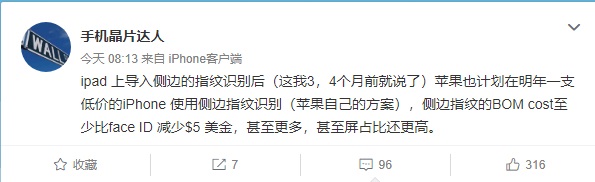 微博博主@手机晶片达人 表示,iPad Air 4上导入侧边的指纹识别后,苹果也计划在明年一支低价的iPhone 使用侧边指纹识别,并且是苹果自己的方案。该博主还表示,侧边指纹的BOM成本至少比face ID 减少5美元,甚至更多,甚至屏占比还更高。