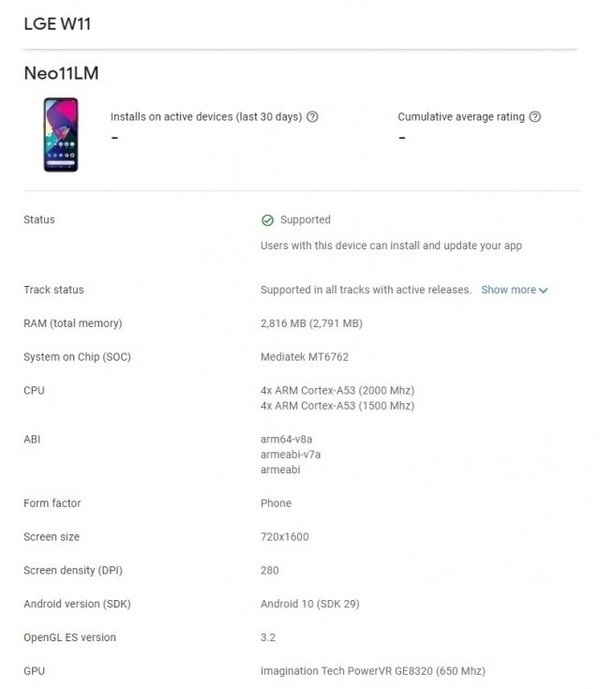 据外媒 GSMArena 报道,此次现身 Google Play 的手机名为 LG W11,型号为 Neo11LM,页面信息显示,该机搭载联发科 Helio P22 处理器,配备了 3GB 运存,很明显定位于中低端市场,此外该机预装系统版本为 Android 10。