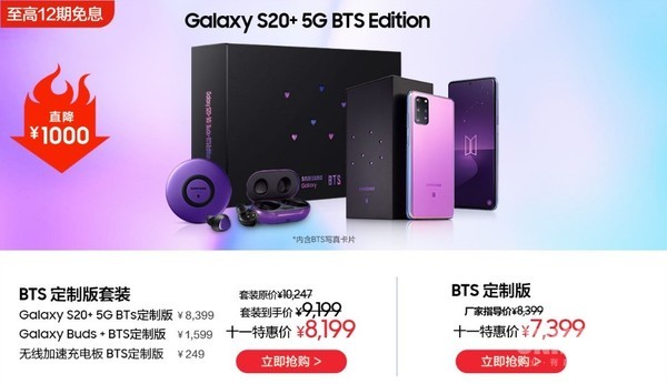 除了三星S20系列,官网显示S20+ 5G BTS定制套装版也直降了1000元,套装原价10247元,到手价9199元,十一特惠价仅为8199元。三星S20+ BTS定制版原售价8399元,十一聚惠价为7399元。此外,十一期间,购买三星其他手机也有优惠,感兴趣的朋友可以去官网查看具体详情。