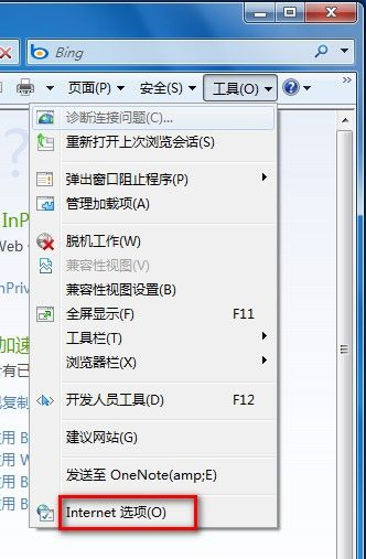 1、打开IE浏览器,点击“工具”选择“Internet选项”;