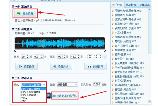 9.可能出現酷我铃声制做专用工具,最先第一步点击加上不久下载的歌曲,以后挑选提取的起始点与终点站,这一步不用去动他,由于是默认设置选中歌曲的全部长短,最终挑选MP3的格式,点击“储存手机铃声到当地”就可以进行MP3格式的变换