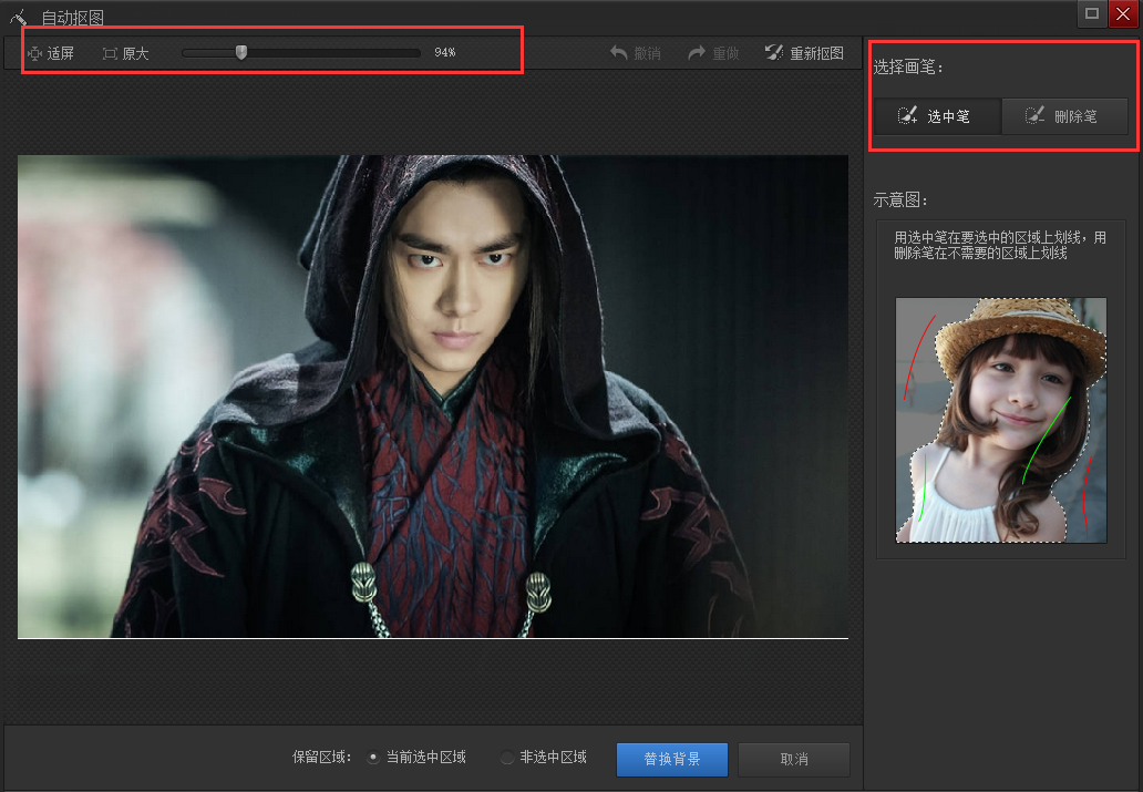 如图,你可以通过放大缩小来调整图片尺寸,在右边有【选中笔】和【删除笔】两种画笔可供选择,