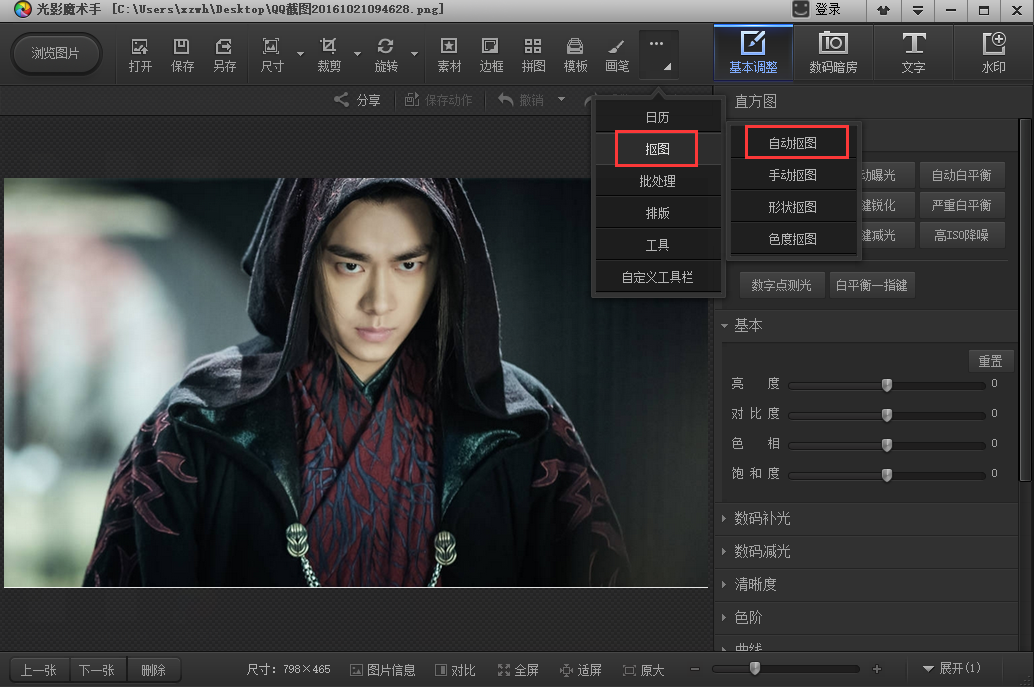 打开光影魔术手,导入一张图片,在菜单栏点击【抠图】——【自动抠图】功能,